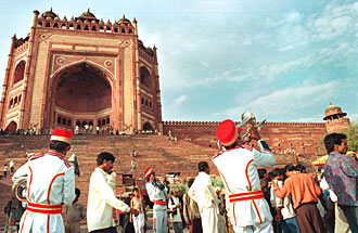 Or maybe it was the mob, throbbing with excitement and expectation. More than a hundred people pushed into the square facing the entrance to the ancient city of Fatehpur Sikri. They swarmed the bottom of steep stone steps, which led up to a magnificently colonnaded arch that looked positively Roman in design. But down below, at the base of the steps, the scene was Indian in every way. So many people were present, pushing, pulling and shouting, that the square seemed certain to explode. Not that there was anything violent or threatening about the crowd, except for the herky-jerky motions of its dance. This seemed primal and chaotic at first glance, but then a symmetry became apparent. The sound was like a spiritual thread woven through the crowd, knitting together hundreds of arms, legs and necks, so that when the drums snapped, so did joints. And when the horns blared, every head in the square moved as if choreographed with concert hall precision. The musicians felt the mumbo, this incredible hot, sticky muse surging across the square. As the drums picked up the beat, or tala, as it is known in India, the horns started spinning an even faster raga, trumpets and trombones flaring in tandem. The mob moved faster and faster, screaming in the sun. The carnival of sound and celebration moved to crescendo. Then, magically, like a happy ending for a saffron fairytale, the bride appeared, seated upon a white pony. She was covered in a veil from head to waist, woven with fine silk threads and flowers, thousands of bright crimson blooms. Across the square, frantic hands pushed the groom through the throngs. He was dressed all in white. His face was euphoric, and slowly he began to shake, hips and shoulders vibrating to his matrimonial raga. The crowd erupted in cheers, the trumpets wailed even louder, and the wedding festival seemed to switch to an even higher gear. "Here, for your health," shouted a voice, almost into my ear. Spinning around, I saw an old Indian man, face partially painted, lips spun into the biggest smile imaginable. He pushed forward a gourd. Inside was a greenish-brown liquid. It smelled sickly-sweet, like the mad mob in this mid-day heat. But, as he pushed it into my face, he was beaming, eyes extolling me to surrender to the spell. I did. I drank it down, swallowing this odd elixir, this essence of India. Only later, after writhing with the wedding jubilee for what seemed like hours, before escaping in my rented Tata sedan, was there time for reflection. What potion had I consumed? What was I doing in the square? How had a the day's excursion from New Delhi taken me so far afield, into this living fantasy? It had all seemed so succinct at the start. My directive was clear and simple. Returning from another assignment in the Himalayas, I had arrived at the hotel in New Delhi and checked in with my editor. There were no flights out until the following night, so that left a day to kill in Delhi. "Take a day off," my editor had advised. "After all, what can you get done in a day. Especially in India?" Indeed, to many visitors, India is just an inch away from impossibility: crowds and congestion, hassles and frustration. Still, the simple aside became a challenge, a kind of quest. A day, after all, is two dozen hours. Ample time, even in India, but for what? Magic? Adventure? Romance? Retreating to the hotel dining hall with guidebook and maps, I began plotting. Surely the capital of India should be capable of encapsulating some measure of the country's allure. It sounds laughable even now. After all, the guidebooks all offer a similar admonishment: "India is not really a country, but more like a continent." Still, continents are conquered the same way as tiny territories; piece by piece. The key is a good plan of attack. And an early start.